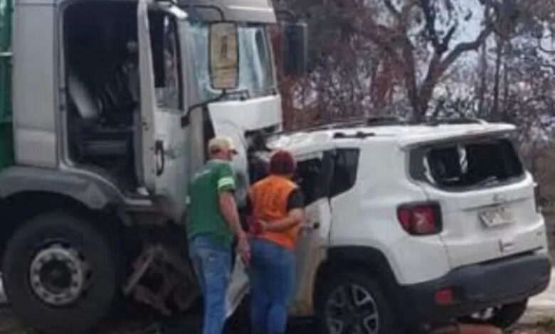Imagens feitas por testemunhas mostram o Jeep completamente destruído após o impacto frontal. O caminhão também teve danos significativos.