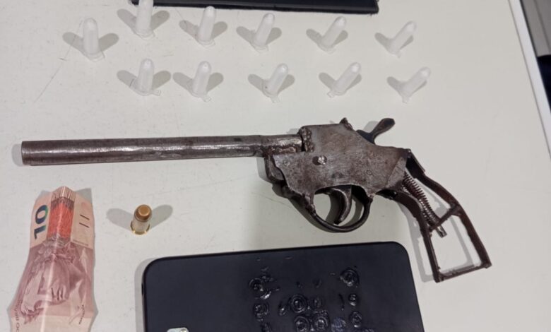 Na abordagem, foram encontrados 11 pinos de cocaína com os suspeitos, além de R$ 10 em dinheiro e um celular sem procedência comprovada. Em buscas no local onde o objeto foi descartado, os agentes localizaram um revólver artesanal calibre .38, municiado e com sinais de tentativa de disparo, além de mais entorpecentes.