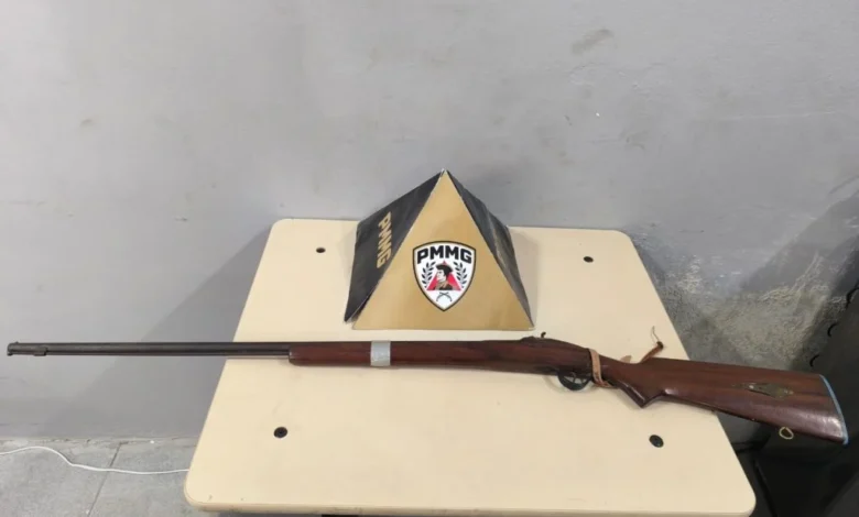No local, na Praça Padre João da Mata Rodarte, os militares abordaram o suspeito e, durante buscas no imóvel, localizaram uma espingarda artesanal do tipo “polveira” no quarto do homem.
